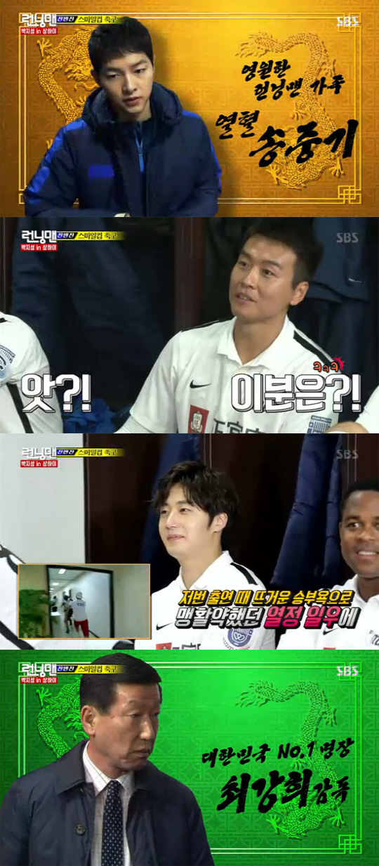 이에 라커실에 옷을 갈아 입으러 들어간 멤버들은 송중기와 마주했다. 송중기 역시 'FC 스마일컵 축구대회'에 참여하게 된 것. 이에 '런닝맨' 멤버들과 뜨거운 포옹을 나누며 반겼다.