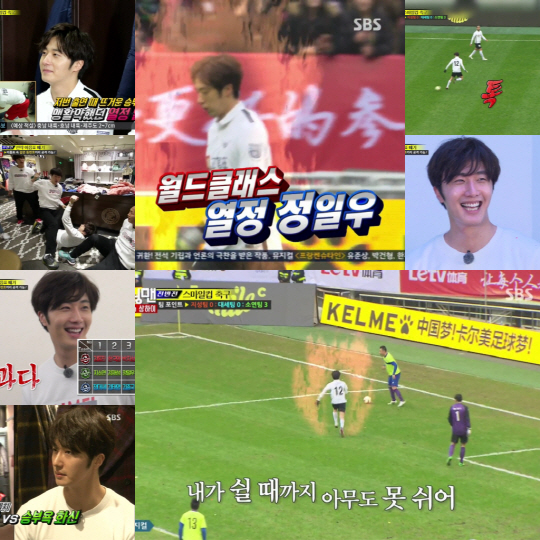 또한, 그라운드를 누비면서도 빛나는 정일우의 자체발광 미모가 시선을 강탈했다. 특히 벤치에 앉아있던 지석진은 쉼 없이 달리는 정일우의 모습을 보며 "멀리서 봐도 잘생겼다"고 감탄해 웃음을 자아냈다. 이뿐만 아니라, 간결한 볼 터치와 패스 실력 등 외모만큼이나 훈훈한 정일우의 축구 실력 또한 이목을 집중시켰다.