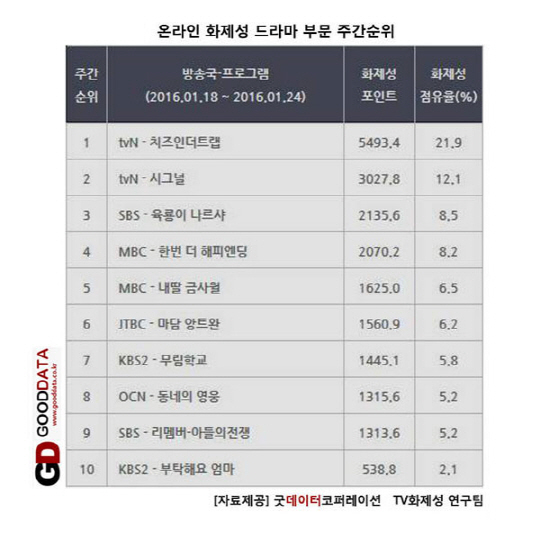 [스포츠조선 이유나 기자] 새 드라마 4편이 동시에 시작된 2016년 네째 주 TV화제성 순위 발표결과 tvN '시그널'이 전체 2위를 차지한 것으로 집계되었다.