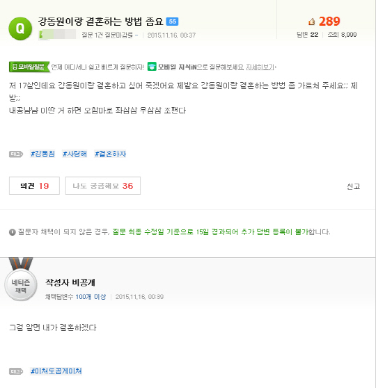 [스포츠조선 고재완 기자] 한 포털사이트에 질문 코너에는 "강동원이랑 결혼하는 방법 좀요"라는 질문이 올라와 화제가 된 바 있다.