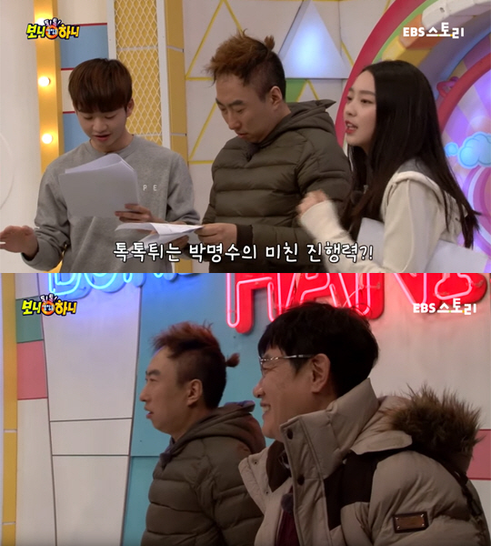 EBS의 공식 유튜브 채널에 공개된 영상에서 박명수는 연신 대본을 보며 보니(신동우)와 하니(이수민)의 '미친 진행력'을 따라가기 위해 예행연습에 열심이다. 이날 현장에는 선배 방송인 이경규도 동행했지만, 보니하니에는 출연하지 않았다. 이경규와 박명수가 KBS '나를 돌아봐' 매니저와 출연자 관계인 만큼, 현장도 함께 찾은 것으로 보인다.