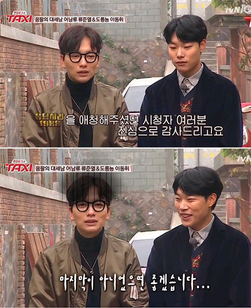 26일 방송된 tvN '현장토크쇼 택시'는 '응답하라 1988' 특집 1탄으로 류준열과 이동휘가 게스트로 출연해 다양한 이야기를 전했다. 류준열과 이동휘는 MC 이영자, 오만석과 함께 '응팔' 쌍문동 골목길 세트장을 둘러보며 그간 알려지지 않았던 촬영 비하인드 스토리를 풀어놨다.
