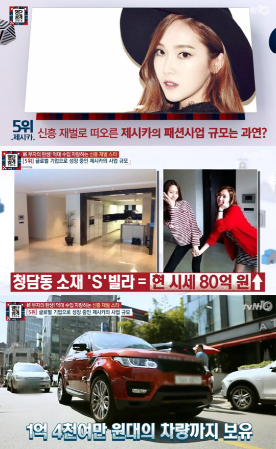 제시카의 사업 수익에도 눈길이 쏠린다. 지난 2014년 열린 팝업스토어에서는 오픈 4시간 만에 1000만원이상 매출을 기록했고, 가족과 함께 거주중 인 것으로 알려진 청담동 소재 S빌라는 현제 시세 80억원 호가한다고 방송은 설명했다. 이어 같은해 방송에서 선보인 자동차 1억 4천만원대라고 덧붙였다. <스포츠조선닷컴>