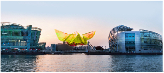물과 하늘 그 사이에서 자유로운 비상의 춤을 추는 황금빛 날개를 감상한 후에는 멀리 한강이 보이는 세빛섬의 1, 2층 전시관에서 '빛' '나비와 꽃' '신체'를 주제로 한 3개의 정원도 만날 수 있다.
