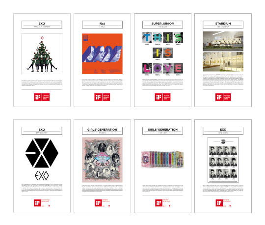 SM은 이번 'iF 디자인 어워드 2016'에서 슈퍼주니어 정규 7집 스페셜 에디션 'THIS IS LOVE', f(x) 정규 4집 '4 Walls', 엑소 겨울 스페셜 앨범 '12월의 기적'(Miracles in December) 등 3개의 앨범이 패키징 디자인 부문에, 서울 DDP(동대문 디자인 플라자)에 위치한 라이프 스타일 숍 STARDIUM(스타디움)이 인테리어?건축 부문 수상작으로 선정, 2개 부문에서 총 4개의 작품이 '본상(Winner)'을 수상하는 기쁨을 누렸다.