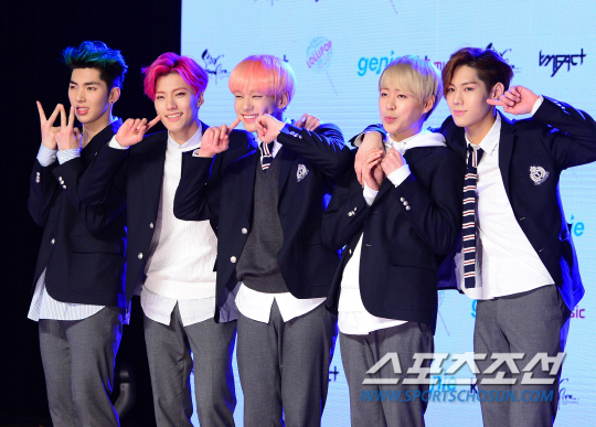 27일 강남구 일지아트홀에서 신인그룹 임팩트(IMFACT)가 데뷔 쇼케이스가 열렸다. 신인그룹 임팩트(IMFACT)는 스타제국에서 제국의아이들과 나인뮤지스 이후 6년 만에 출격시키는 아이돌 그룹으로 전 멤버가 작사, 작곡, 안무 창작 등 프로듀싱이 가능한 차세대 실력파 그룹이다. 데뷔 쇼케이스 무대에서 깜찍한 포즈를 취하고 있는 임팩트 멤버들. 송정헌 기자 songs@sportschosun.com/2016.01.27