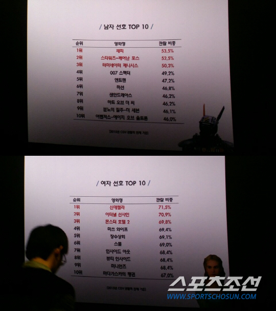 CGV 리서치센터 이승원 팀장이 28일 서울 영등포CGV에서 진행된 'CGV 미디어포럼'에서 이같이 밝혔다. 이 팀장에 따르면 남성 관객은 지난해 '채피'를 가장 많이 봤고 뒤를 이어 '스타워즈 깨어난 포스' '터미네이터 제니시스' '007 스펙터' '앤트맨' 등의 순으로 영화를 봤다.