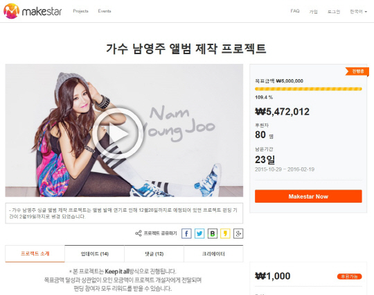 한편, 메이크스타(www.makestar.co)는 한류에 특화된 글로벌 크라우드펀딩 플랫폼으로, 남영주 싱글음반 제작프로젝트 이외에 스텔라 미니앨범 제작 프로젝트,기부콜라보레이션1탄 XIA준수와 이주영 디자이너 프로젝트, 라니아, 데이비드 오,로드보이즈 등의 음반제작 프로젝트 등 다양한 프로젝트들이 높은 성공률을 달성하며 진행 중에 있다. 지상파 미니시리즈 드라마, 한중 합작 웹드라마, 월드 투어 콘서트, 팬미팅, 사진집 등 다양한 프로젝트를 준비 중이다.