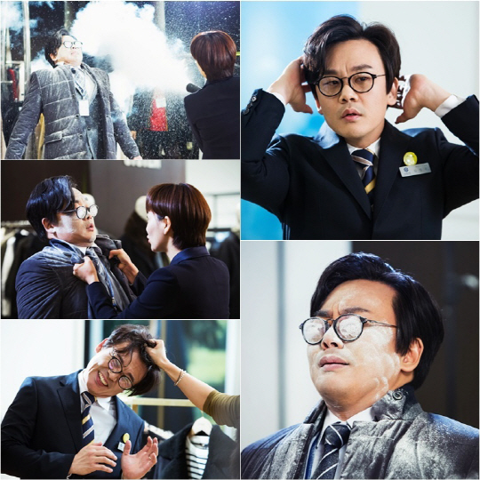 이와 관련 김인권이 '만년 과장' 김영수 캐릭터로 완벽 변신, 다사다난한 직장 생활을 겪어내는 장면이 공개돼 시선을 모으고 있다. 김인권이 백화점 한가운데서 한 여성으로부터 소화기 가루를 무참히 맞아, 안경은 물론 온몸이 흰 가루로 범벅이 되는 수모를 당하고 있는 것. 게다가 김인권은 멱살은 물론 머리채를 쥐어 잡힌 와중에도 끝까지 웃는 얼굴을 유지하는 모습으로, 보는 이들을 웃프게 만들고 있다.