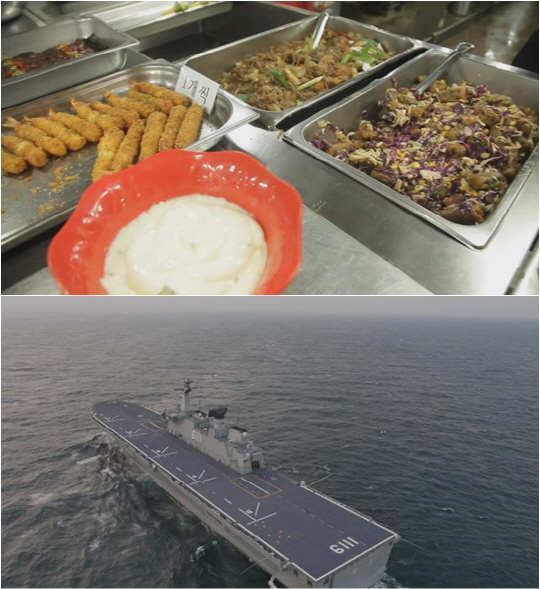 배 안에서의 첫 저녁식사를 시작으로 본격적인 함상생활이 시작됐다. 이들을 가장 먼저 놀라게 한 건 다름 아닌 식판이었다. 늘 사용하던 스테인리스 식판이 아닌, 마치 뷔페에 온 듯 원형 접시를 사용해 배식을 받았다. 심지어 식단 또한 한층 업그레이드 돼 모두를 감격하게 했다.