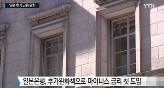 일본은행은 이날 기준금리를 -0.1%로 채택했다. 지금까지 민간 은행의 예금에 대해 연 0.1%의 이자를 지급했지만 앞으로는 0.1%의 수수료를 받겠다는 것이다. 은행 대출 증가와 금리 하락, 엔화 약세 촉진 등 효과가 기대된다고 교도통신은 전했다.