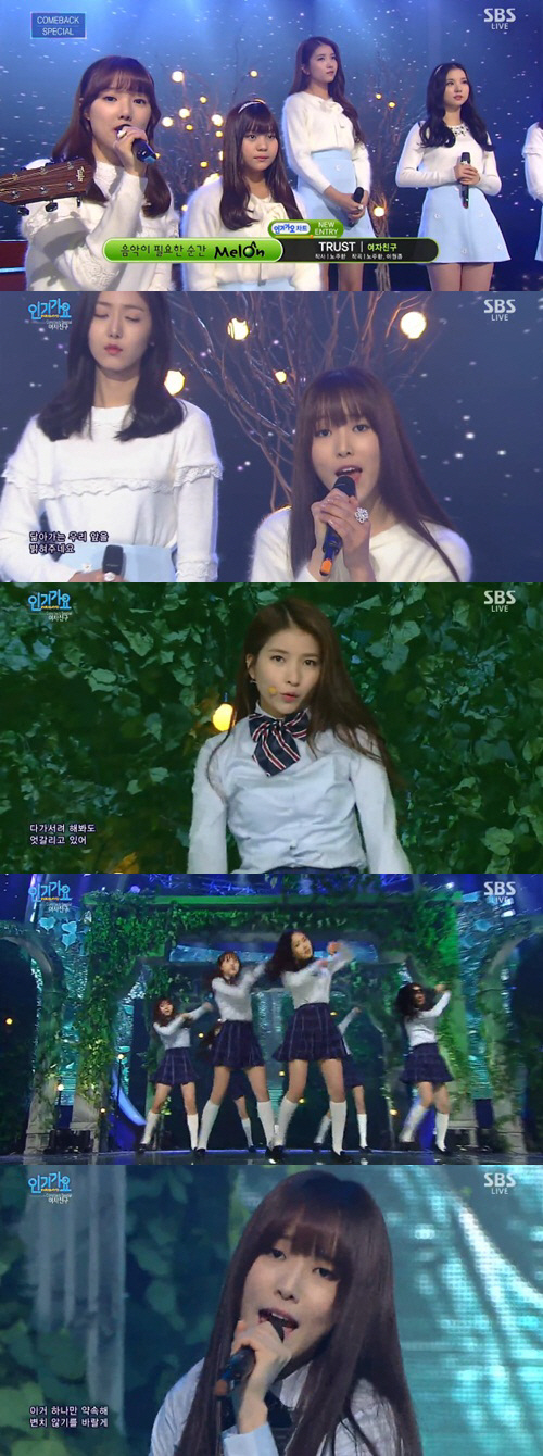 여자친구는 31일 오후 방송된 SBS '인기가요'에서 발라드곡 '트러스트(TRUST)'와 타이틀곡 '시간을 달려서' 무대를 선보였다.