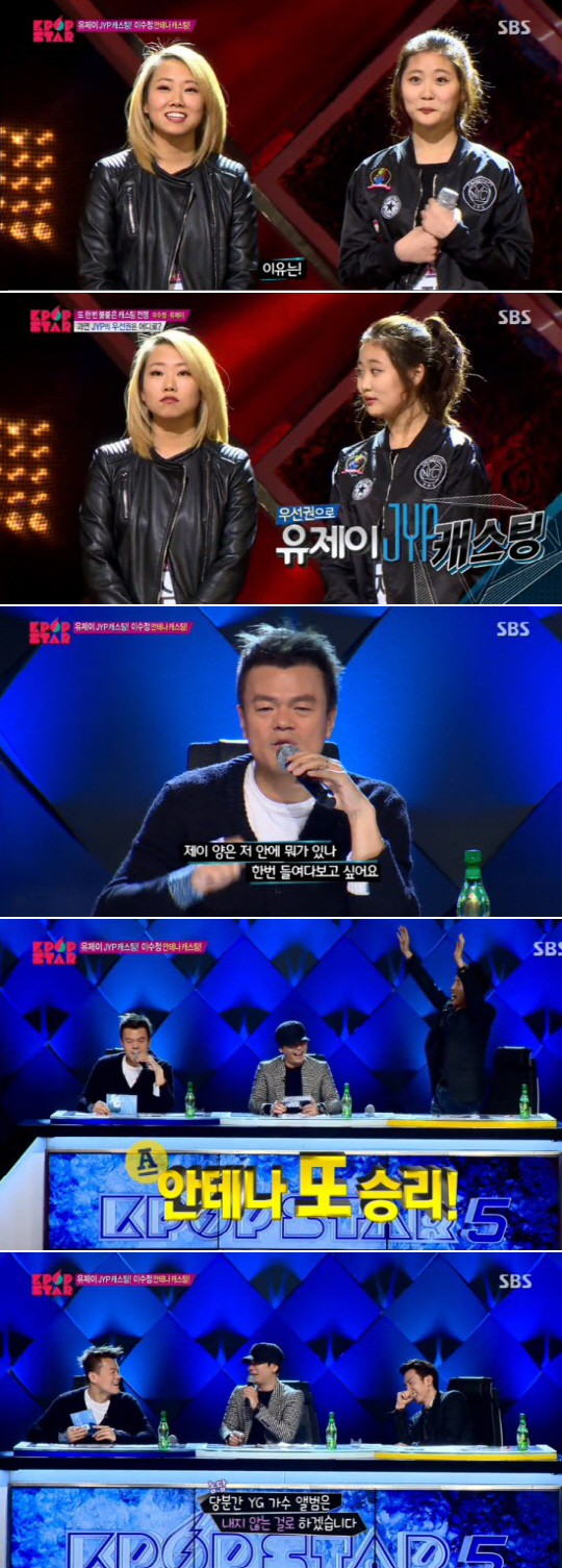 두 사람의 캐스팅이 시작하자, 안테나는 일찌감치 이수정을 캐스팅했고, YG는 유제이를 선택했다. 하지만 JYP가 "이순간을 기다렸다."우선권을 사용해 유제이를 캐스팅했고 YG는 정진우에 이어 유제이도 타사에 빼앗기는 꿀재미를 시청자에게 선사했다. 양현석 심사위원은 "2016년 시작이 좋지 않다. 당분간 YG의 앨범은 내지 않는 것으로 하겠다."며 농담섞인 아쉬움을 짙게 내?b었다.