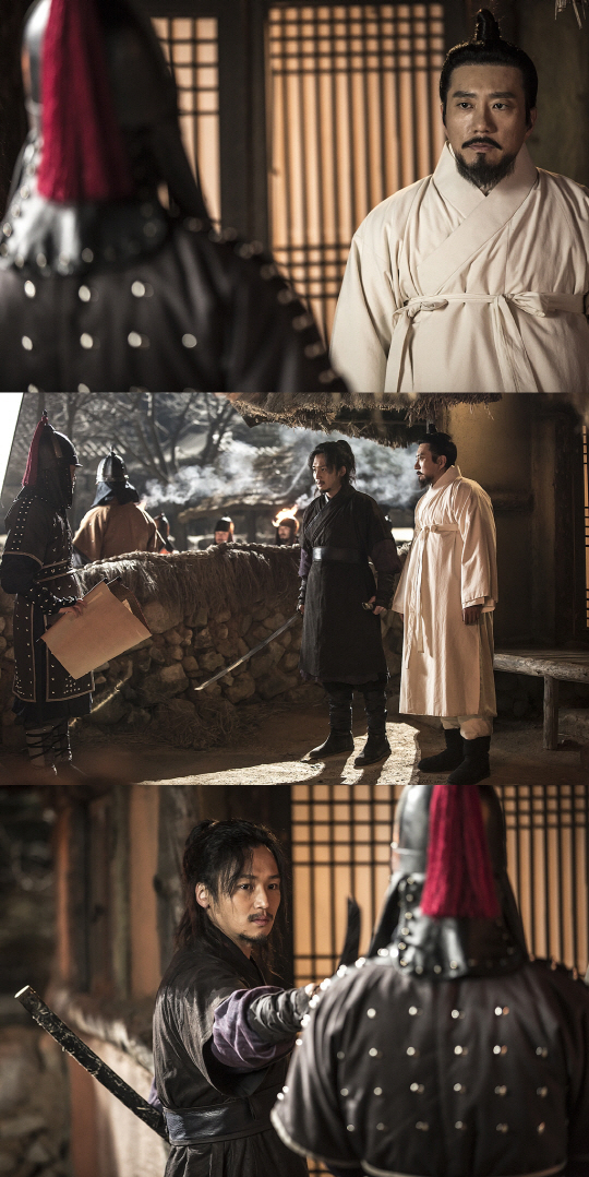 공개된 사진 속 정도전은 어두운 밤, 유배를 떠나 머물던 곳에 서 있다. 그의 곁에는 개경에서 단숨에 달려온 호위무사 이방지가 함께 서 있다. 그리고 그들의 앞에는 장계를 들고 온 병사가 우뚝 서 있다. 이성계가 자리를 비운 사이, 이성계의 생사조차 알 수 없는 상황에서 유배를 떠나 있는 정도전에게 떨어진 명령은 무엇일까.