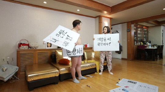 이 모습을 지켜보던 김숙은 피켓을 허리띠처럼 만들어 윤정수의 맨 몸에 고정시키는 파격적인 코디를 완성했다. 그리고는 엄동설한에 밖으로 나가 함께 시청 자제 운동을 펼쳐 동네 주민들의 시선을 사로잡았다.