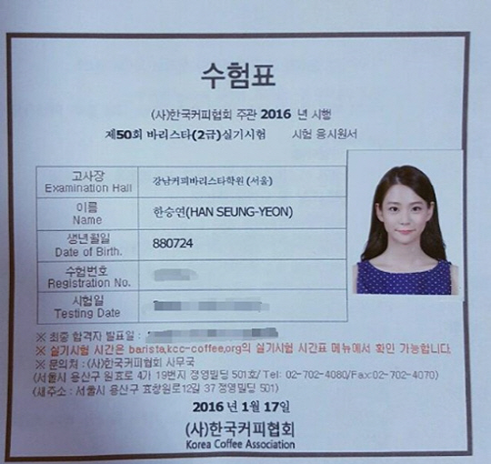 1일 한승연은 자신의 인스타그램에 "아직 자격증 수령은 못했지만 진짜 오랜만인 수험표. 이렇게 지내고있어요^^"라는 글과 함께 한 장의 사진을 게재했다.