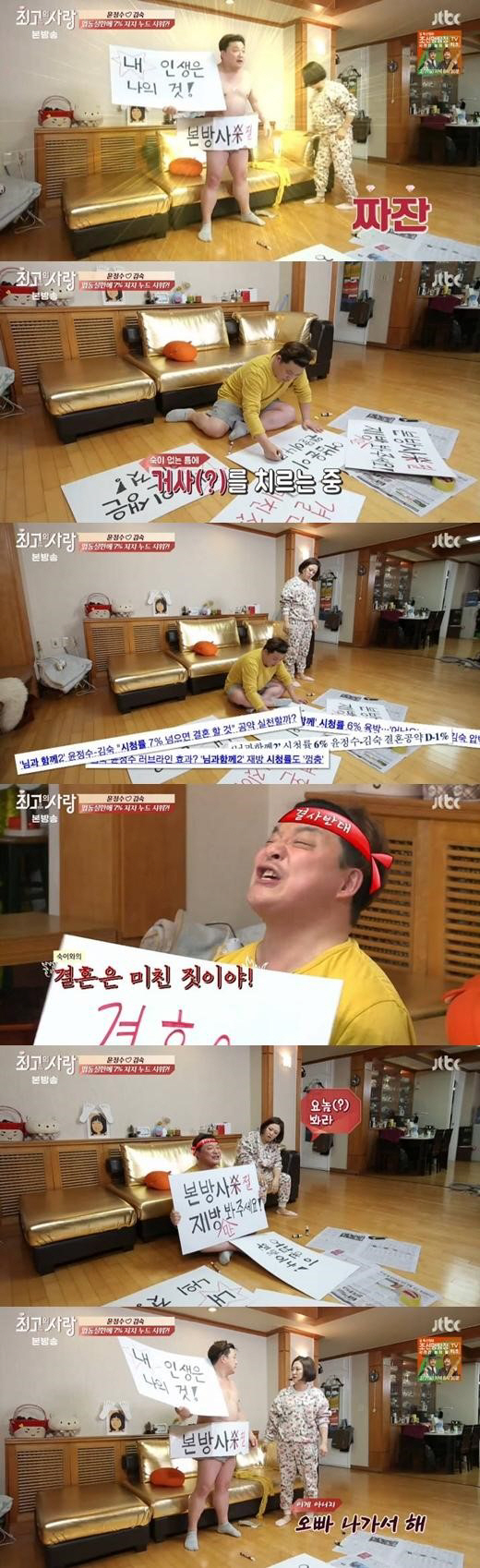 이를 본 김숙은 피켓을 찢은 뒤 "뭐 하는 거냐?"고 물었고, 윤정수는 "내 인생을 지키려는 거다. 1인 시위를 할 거다"고 말했다. 이에 김숙은 "옷을 벗고 시위를 하면 사람들이 주목 할 거다"고 조언했고, 실제 윤정수는 옷을 벗은 채로 1인 시위를 시작했다.