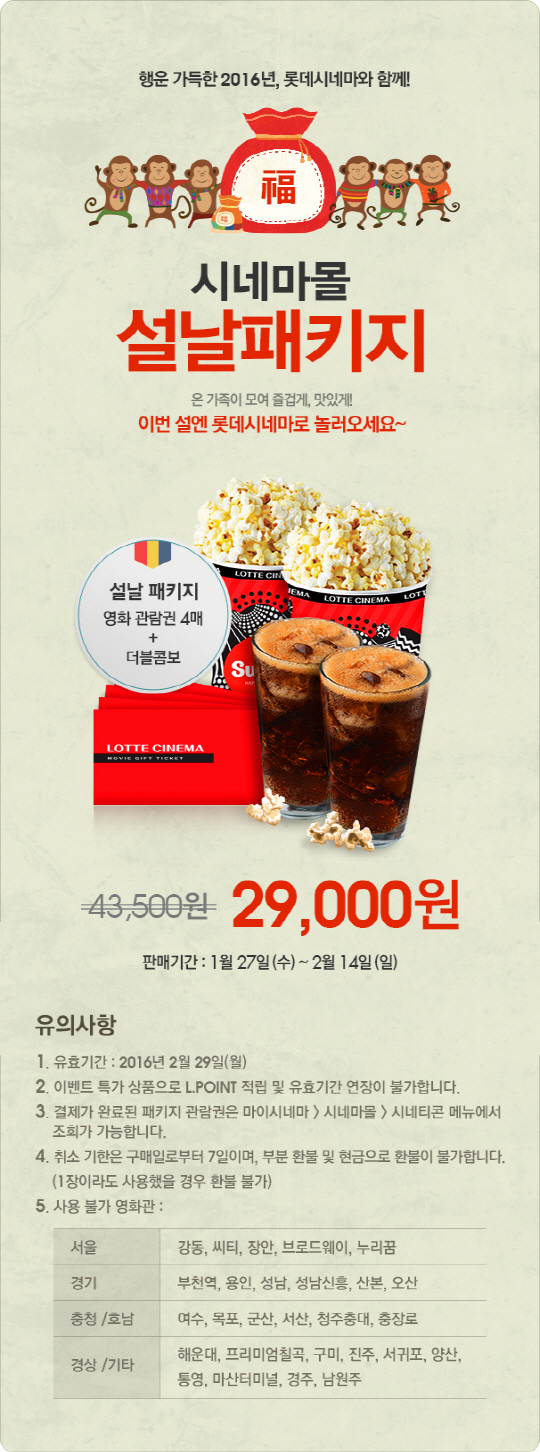 [스포츠조선 고재완 기자] 롯데시네마는 2016년 설은 맞이해 행운을 드리고자 '설맞이 럭키박스' 이벤트와 온 가족의 실속있는 영화관람을 위해 '설 패키지' 상품의 판매를 진행한다.