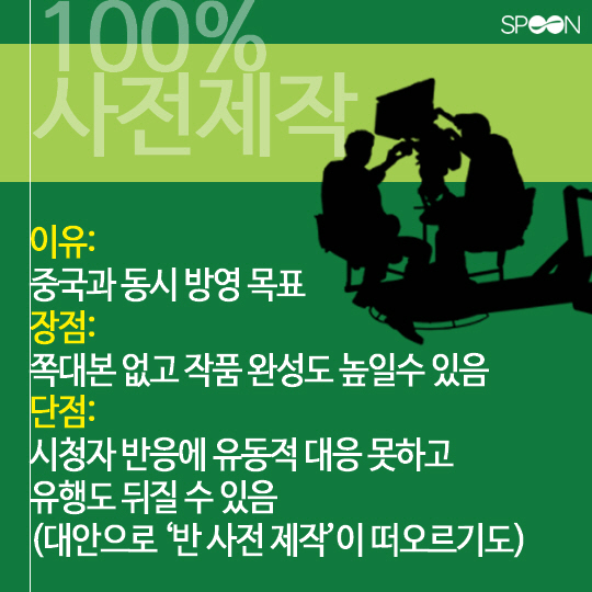 사전제작 드라마가 대세로 떠오르고 있습니다. 올해 방영을 앞둔 대부분의 기대작들은 '100% 사전 제작'으로 진행되는 분위기입니다. 가장 큰 이유는 바로 중국과의 동시방영을 위해서는 '100% 사전 제작'이 필요하기 때문입니다. 사전 제작을 하게되면 제작사는 드라마의 완성도를 높일 수 있고 작품을 중국에 비싸게 팔 수 있으며 그 수익으로 제작비를 충당할 수 있습니다. 또한 기존 방송사와의 갑-을 관계를 벗어나 지상파 의존도를 낮출 수있는 장점도 있습니다. 물론 중국 자본에 잠식당하지 않으면서 콘텐츠 경쟁력을 키우는 것도 잊어서는 안 될 부분 입니다.