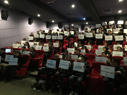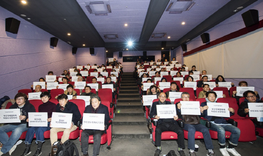 지난 3일 한국영화감독조합이 극장 아트나인에서 총회를 갖고 '부산국제영화제의 독립성을 지켜달라'는 퍼포먼스를 선보인 것. 이준익 감독에 이어 봉준호 감독을 새로운 대표로 맞이한 이날 총회에서 조합 소속 감독들은 최근 부산국제영화제가 시의 압력을 받는 상황에 우려를 표하며 각종 피켓을 들고 단체 사진을 찍었다. 이준익, 봉준호 감독 외에 부 대표로 선출된 최동훈, 류승완, 변영주, 정윤철 감독이 참여했으며 이장호 감독도 최연장자로 자리를 지켰다.