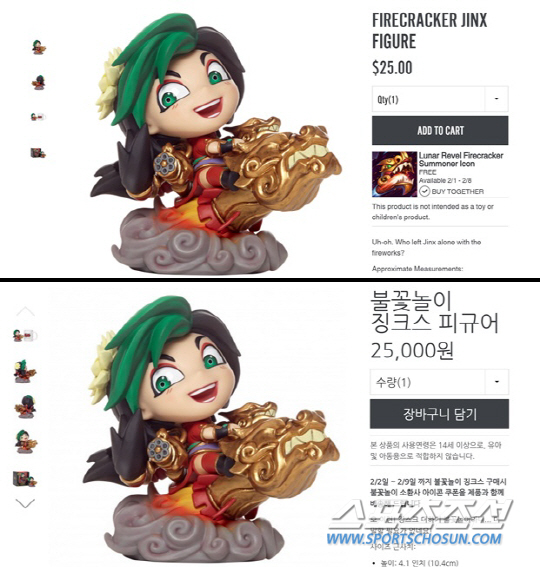신규 상품인 'Firecracker Jinx' 피규어의 북미 스토어 가격은 25달러이다. 단순히 금일(2월 2일)의 국내 달러 매매기준 환율(1,207원)을 적용하면 약 3만 원이지만, 국내 스토어에서 판매 중인 동일 상품인 '불꽃놀이 징크스' 피규어의 가격은 25,000원이다. 해당 제품 이외에도 라이엇 스토어에서 판매 중인 모든 제품은 이러한 1달러 대비 1,000원의 환율이 적용되어 가격이 책정되어 있다.