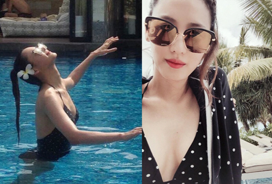 가슴 라인이 파인 도트무늬 비키니 차림의 수현은 군살 없는 늘씬한 자태를 뽐내고 있어 시선을 집중시켰다.