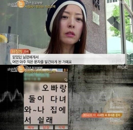 서정희는 "'남편이 일본을 다녀오겠다'고 했는데 사실은 홍콩을 다녀왔다. 그래서 여권을 달라고 했더니 갑자기 배가 아프다고 화장실을 가더니 여권을 보여주더라. 여권을 다 지워서 나왔다"며 "조카한테 (지출) 내역서를 떼어 달랬는데 다른 호텔, 홍콩에서 먹은 것과 쇼핑몰을 다닌 것 등을 내가 알게 된 거다"고 서세원의 외도를 주장했다.