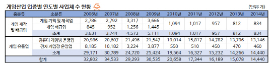 게임 제작과 배급업을 담당하는 업체는 2009년 정점을 찍은 후 매년 감소, 2014년 834개만 남았다. 사업체 중 가장 큰 비중을 차지하는 PC방도 2009년 2만여개에서 2014년 1만 3천여개가 생존해 5년 사이에 7천여개의 PC방이 없어졌다.