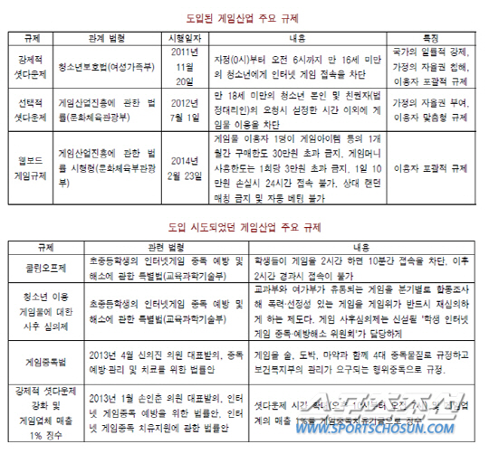 이러한 요인으로 가장 먼저 규제 중심의 국내 게임 관련 법안들이 도마에 오르고 있다. 한국경제연구원은 최근 보고서를 통해 셧다운제가 게임업계에 미치는 영향을 분석해 '게임산업 규제정책의 전환 필요성 및 개선방향 보고서'를 발간했다.