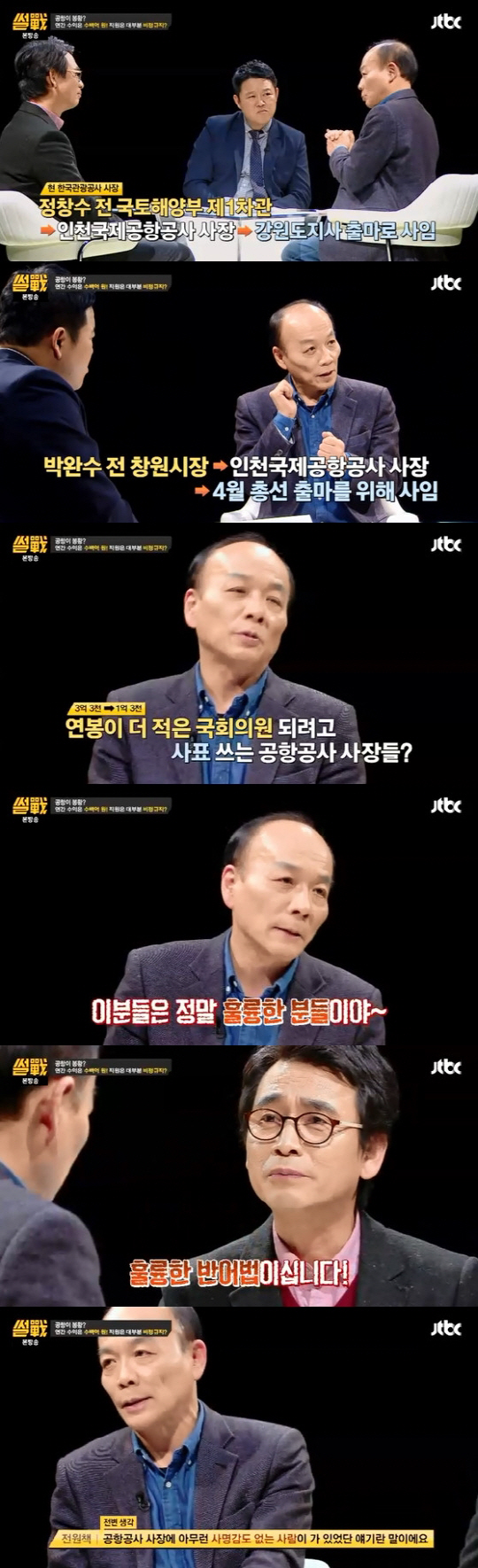 전원책은 "김석기 한국공항공사 전 사장의 연봉이 (2014년 기준) 약 3억 3천만 원이다. 인천국제공항공사 사장 연봉은 3억 3백만 원"이라며 공항공사사장들의 총선 출마를 언급했다. 박완수 인천공항공사 사장과 김석기 한국공항공사 사장 모두 4월 총선 출마를 위해 사임했다.