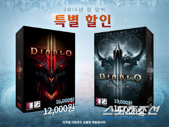 최근 적용된 2.4.0 패치와 5시즌을 통해 새롭고 다양한 콘텐츠가 대거 추가돼 PC방 순위 상위권으로 재진입하는 화제를 낳고 있는 '디아블로 3'를 설 연휴를 맞이해 경험해 볼 수 있도록 기획됐다. 11일까지 '디아블로 3'와 확장팩 '디아블로 3: 영혼을 거두는 자'의 PC 버전 디지털 제품의 전 제품군에 대해 각각 할인 혜택이 제공된다. '디아블로 3'는 1만2000원 (기존가 1만6000원), '영혼을 거두는 자' 일반판은 1만4000원 (기존가 1만9000원), '영혼을 거두는 자' 디지털 딜럭스는 3만4000원 (기존가 3만9000원), 그리고 '디아블로 3: 통합본'은 2만6000원 (기존가 3만원)에 블리자드 공식 홈페이지의 배틀넷 샵에서 구매 가능하다. 단 시리즈의 확장팩인 '영혼을 거두는 자'를 플레이하기 위해서는 '디아블로 3'가 있어야 한다.