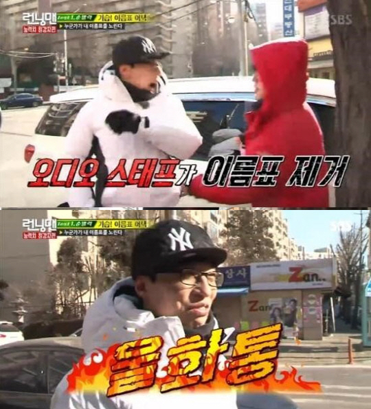 '런닝맨' 유재석이 스태프에게 이름표를 뜯겨 울화통을 터뜨렸다.