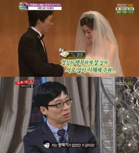 유재석은 과거 방송된 MBC ''놀러와-트루맨쇼'에서 결혼을 앞둔 가서 별의 "예비 신랑 하하와 최근 권태기에 대해 많은 얘기를 나누고 있다"며 "언젠가 찾아올 권태기를 어떻게 극복해야 할지 알고 싶다"는 고민에 답변을 내놓았다.