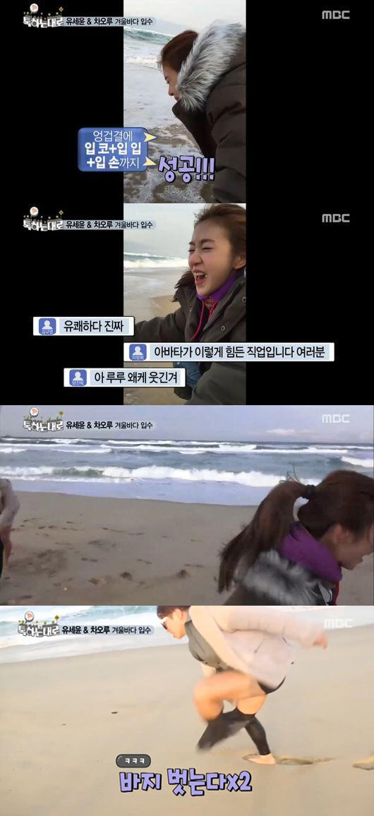 차오루는 엉겁결에 '입 코+입 입+입 손'을 입수까지 성공했다. 이어 유세윤은 영하 8도의 날씨에 허벅지 입수를 위해 바지를 벗었다. 내복 차림으로 입수한 그는 얼음장 같은 바닷물에 물에 젖은 내복을 벗으며 달리기 시작했다.