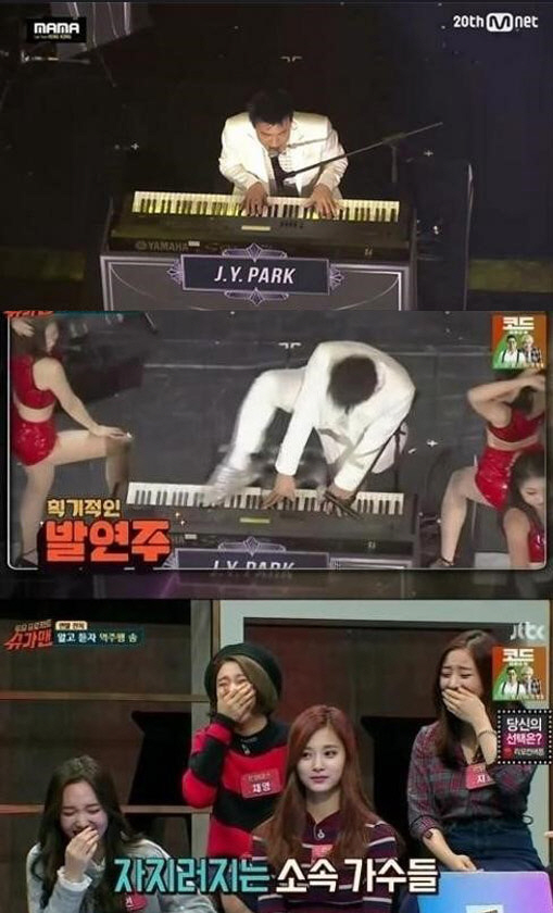 한편 박진영은 지난 해 11월 홍콩에서 진행된 2015 MAMA에서 발 피아노 퍼포먼스를 펼친 바 있다. 그는 7일 방송된 SBS '일요일이 좋다-K팝스타5'에서 "피아노 연주를 하다 감정이 복받쳐 올라서 발을 올렸다. 그게 왜 웃긴지 아직도 모르겠다"고 말해 모두를 폭소케 했다. <스포츠조선닷컴>