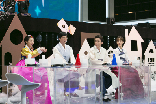 9일(화) 밤 10시 50분에 방송되는 JTBC 예능 프로그램 '투유프로젝트-슈가맨' 17회는 설특집으로 꾸며졌다. 이에 '슈가맨' MC 유재석 유희열 김이나 산다라박은 한복을 입고 진행에 나섰다.