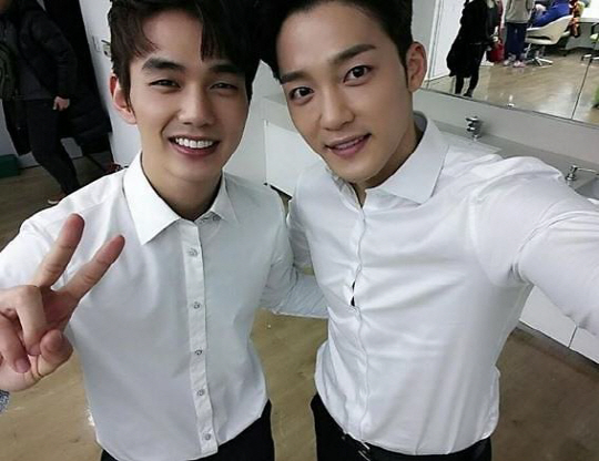 공개된 사진에서 김진우는 유승호와 함께 시원한 웃음을 지으며 카메라를 응시하고 있다. 두 배우의 빛나는 외모가 돋보인다.