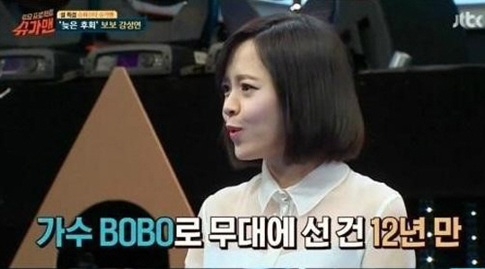 강성연은 9일 JTBC '투유 프로젝트-슈가맨'에 출연했다. 강성연은 지난 2001년 보보라는 예명으로 '늦은 후회'를 불러 히트시킨 바 있다. 이날 강성연은 12년만의 가수 무대에서 감미로운 목소리로 '늦은 후회'를 불러 박수를 받았다.