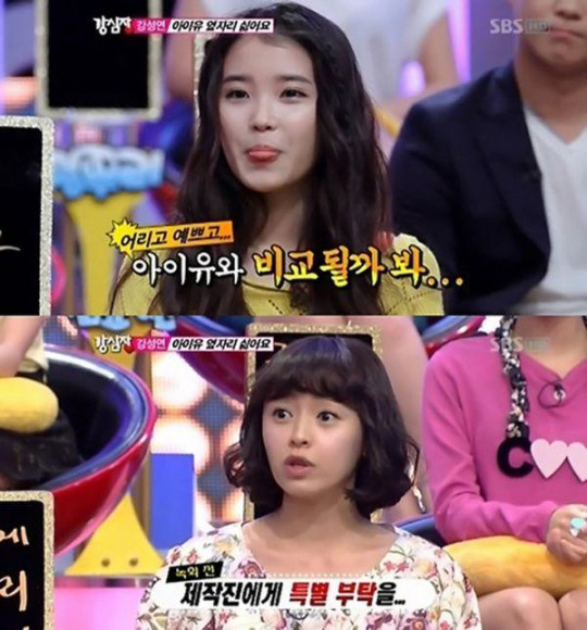 강성연은 "'아이유 님'이 나온다는 말을 듣고 비교될까봐 제작진에게 '아이유 님과 멀지도 가깝지도 않은 자리에 앉혀달라'라고 부탁했다"라고 강조했다.