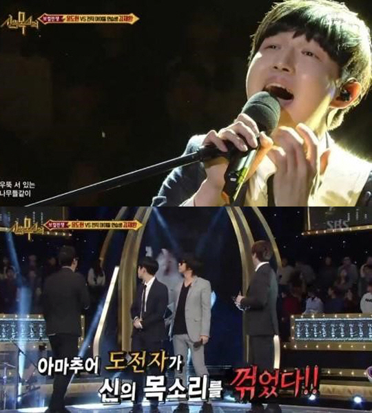 '보컬전쟁 신의 목소리'에서 도전자 김재환 씨가 프로 가수를 상대로 아마추어의 유일한 승리를 거뒀다.