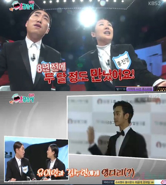 이어 홍진경은 "김수현과 양다리를 걸치는 바람에 유아인과 헤어졌다. 이민호가 하도 따라다녀 스토커로 신고했다"라며 무리수 콘셉트를 이어갔다. 듣다 못한 장동민은 "거기 몽둥이 같은 거 없냐"라고 일침을 던져 좌중을 웃겼다.