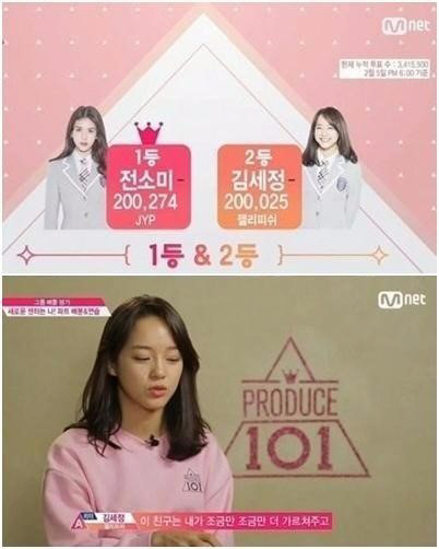 반면 김세정은 젤리피쉬 엔터테인먼트 소속이라는 점이 주목받았을 뿐, 프로듀스 101이 사실상 데뷔 무대다. 하지만 김세정은 방송 시작 이후 꾸준히 전소미를 따라잡은 끝에 마침내 선두 도약을 눈앞에 두고 있다. 표 차이는 200여표에 불과하다.