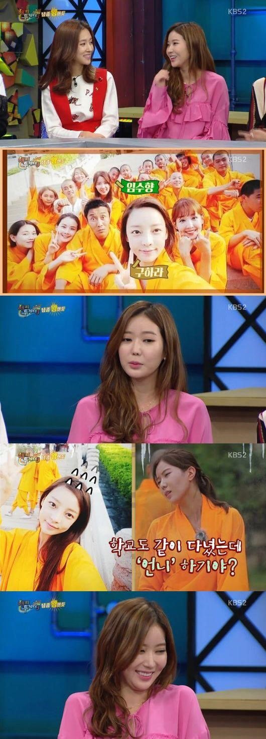 이어 임수향은 "'소림사'에 함께 갔던 구하라와 한 살 차이"라며 "한 살 차이 밖에 안 나는데 구하라가 유독 나를 어려워하더라"고 털어놨다.