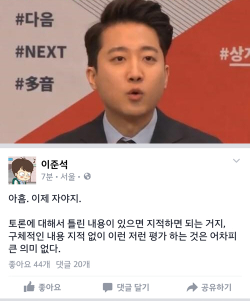 이준석 전 비대위원은 자신의 SNS에 "아흠. 이제 자야지. 토론에 대해서 틀린 내용이 있으면 지적하면 되는 거지, 구체적인 내용 지적 없이 이런 저런 평가 하는 것은 어차피 큰 의미 없다"고 글을 남겨 눈길을 끌었다.