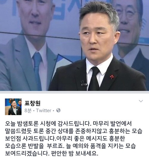 밤샘토론이 끝난 직후 표창원 전 교수는 자신의 트위터에 "오늘 밤샘토론 시청에 감사드립니다. 마무리 발언에서 말씀드렸듯 토론 중간 상대를 존중하지않고 흥분하는 모습 보인점 사과드립니다. 아무리 좋은 메시지도 흥분한 모습으론 반발을 부르죠. 늘 예의와 품격을 지키는 모습 보여드리겠습니다. 편안한 밤 보내세요"라는 글을 남겼다.