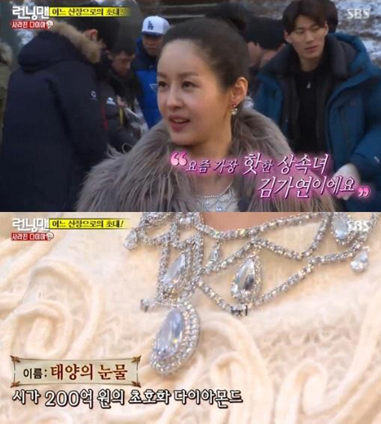 유재석은 털코트 차림으로 등장한 김가연에게 "아, 전 밖에서 오시는데 삽살개인줄 알았다"라며 김가연의 패션에 혹평을 내렸다. 김가연은 발끈하며 "왜이러세요? 이거 물건너 온 거예요. 내가 요즘 가장 핫한 상속녀다. 가진 것은 미모와 돈 뿐"이라고 강조한 뒤 코트를 벗고 다이아몬드 목걸이를 자랑했다.