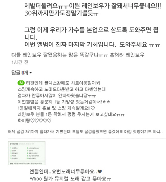 하지만 '후'는 달랐다. '후'는 15일 오후 5시 89위로 가까스로 생존하더니 이후 기적 같은 상승세를 보이고 있다. 레인보우는 15일 저녁 51위로 올라선데 이어 16일 아침에는 44위, 급기야 26위까지 올라섰다가 현재는 28위로 한발짝 물러섰다. 추천곡에 선정되지 않았음에도 믿을 수 없는 오름세다. 벅스 26위, 엠넷 11위, 올레뮤직 9위, 소리바다 9위 등 멜론 이외의 사이트에서도 기세가 만만치 않다.