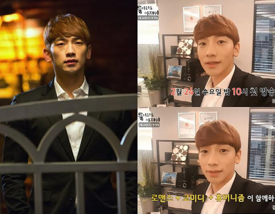 우선 비는 자신의 사무실로 설정된 촬영장에서 휴대폰 카메라를 꺼내들고는 '돌아와요 아저씨'의 첫방송 날짜와 시간을 알렸다. 그리고는 "저희 드라마는 로맨스와 코미디, 그리고 휴머니즘이 있는 드라마"라며 "많은 사랑과 관심을 부탁드린다"라고 소개했다.
