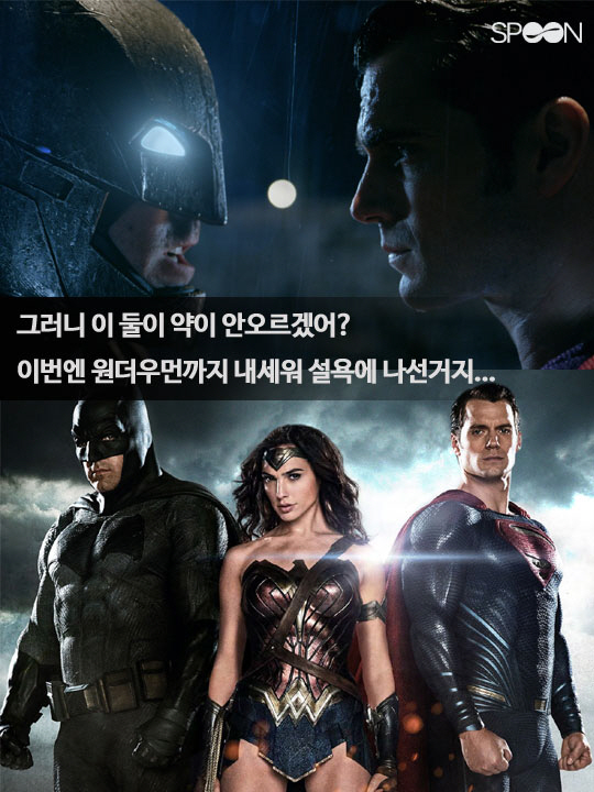 [스포츠조선 고재완 기자] 영화 '배트맨 대 슈퍼맨: 저스티스의 시작'(이하 배트맨 대 슈퍼맨)이 3월 24일 개봉을 확정지었습니다. '마블' 영화에 밀렸던 'DC'가 역전의 발판을 마련하고자 야심차게 제작한 영화가 바로 '배트맨 대 슈퍼맨'인데요. 그동안 '아이언맨' '어벤져스' 시리즈 등으로 승승장구하던 '마블'과 달리 'DC'는 제작하는 영화마다 흥행에 참패하며 쓴맛을 봤는데요. 이번 작품으로 화끈한 설욕전을 펼칠지 관심이 모아지고 있습니다.