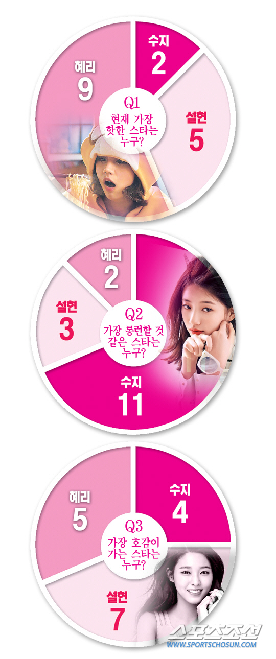 이런 가운데 스포츠조선은 연예계 전문가 16인을 대상으로 긴급 설문 조사를 통해 '新 트로이카 시대'를 이끌고 있는 수지, 설현, 혜리에 대한 다방면 분석을 실시했다. 설문에 응한 전문가들은 연예계에서 10년 이상 활동한 기획사 이사급 이상을 비롯해 연예계의 트렌드를 가장 빠르고 정확하게 파악하고 있는 홍보 전문가들이 포함돼 있다.